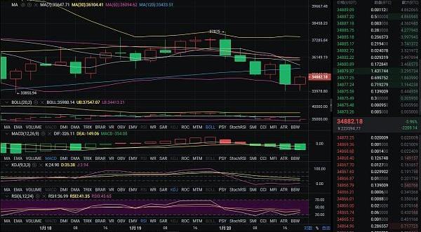 比特幣目前走勢未能形成有效的止跌企穩行情,在短暫的沖高37875后就開始一路下行,可以說是疲態盡顯。小時圖上比特幣日內呈階梯式震蕩下行姿態,最低跌至34000,目前在34800附近震蕩。日線收陰,行情穩居布林中軌下方,且布林帶縮口。目前我們從小時級別圖可以看到,目前幣價經過一波拉升之后,已經到達了一個相對的高點。能明顯的看到上方壓力位是非常強勁的,另外馬上進入回調區間。附圖指標MACD快慢線在超賣區由粘合向上轉換成為粘合向下有開口跡象。因此短期內比特幣預計還會有一波跌幅,就看下方前期的三針探底能不能撐住。