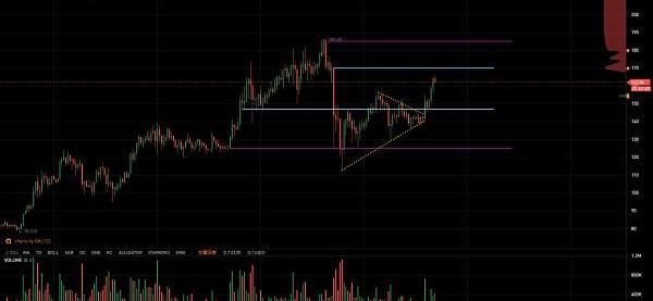 如圖所示,萊特幣于昨晚成功突破收斂結構,同時萊特幣也是主流幣中突破收斂結構最早的一個,但后勁稍顯不足。萊特幣短期壓力和支撐分別為170和147附近,中期壓力和支撐關注180和125一線。