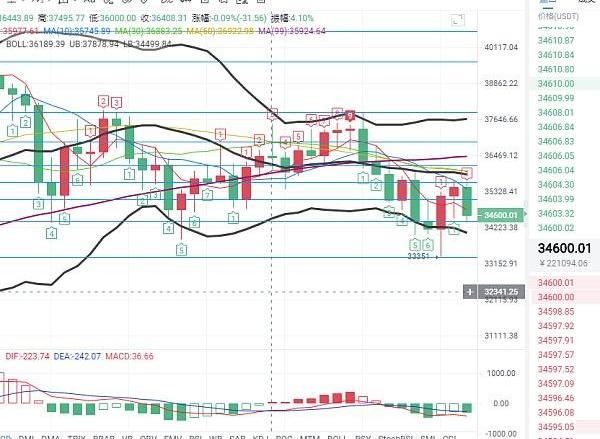 ????昨日大餅從37855附近開始一路下跌,直至今日凌晨下探至33351美元一線后開始反彈,日內跌幅超過4500美元。從4小時圖上來看,進過早盤的拉伸后,幣價觸及35600美元附近后,再度開始回調,當前幣價徘徊在34600附近。布林帶呈收口狀,MACD快慢線穿過0軸向下發散,空頭動能的二次放量證明整盤短線內仍然有一定的下浮空間,短線上操作建議反彈做空。?