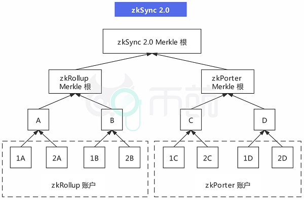 具體而言,zkSync 2.0 的 Merkle 樹架構如下圖所示,分為 zkRollup 和 zkPorter 兩個分支,兩者有各自的 Merkle 根,并在各自的葉子節點上產生了兩種賬戶:zkRollup 賬戶和 zkPorter 賬戶。用戶在 zkSync 2.0 可以享受 zkRollup 和 zkPorter 賬戶的混合體驗,能夠自由選擇賬戶類型,且兩者是完全可互操作的。