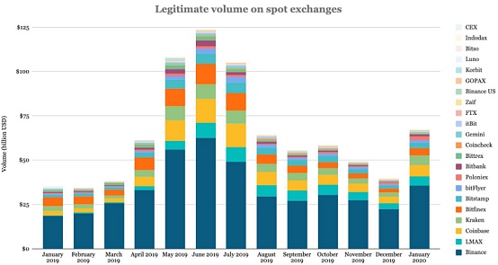 1月,有53%的合法交易量發生在Binance。Coinbase占據了9.4%的市場交易量,緊隨其后的是Kraken(8.1%),LMAX(7.7%),Bitfinex(6.2%)和Bitstamp(4.4%)。