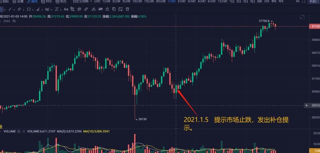 市場達到高點34700后,再次走了一段時間的回踩整理。1月5號,雨神確認止跌信號后,再次發出買入提示。隨即,市場再次開啟新一輪的上漲,一路從31000上沖至37000。