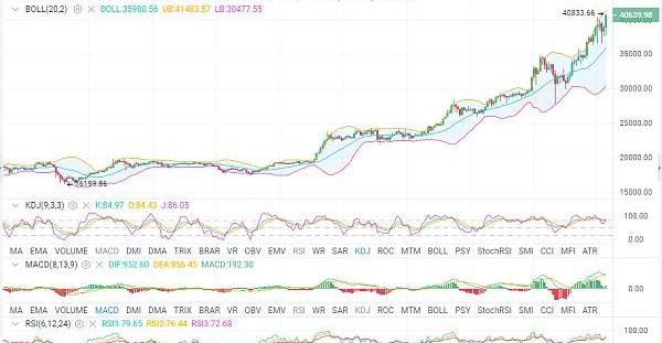 小時圖上看,價格目前短線承壓于布林帶中軌位置,此前價格向下插針也是試探了一次布林帶下軌位置支撐后迅速反彈,目前布林帶逐漸收口。5日均線逐漸走平。整體來看,比特幣走勢目前仍是一個寬幅震蕩的格局。不過大的趨勢依然是保持上行的。那么后市仍是建議回調多單為主,下方關注38000位置支撐,上方持續關注40000位置壓制。
