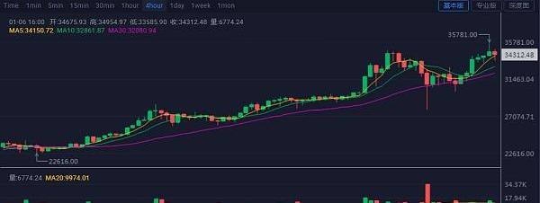 比特幣價格昨日晚間至日內早間上行觸及34372位置后價格圍繞在34000附近盤整,直至午間價格收到消息面刺激短時間向上拉升至35781位置高點,隨后價格走出回落,價格最低給到33585位置。