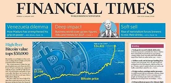 英國《金融時報》當天在頭版頭條刊登文章《高飛者:比特幣價格站上30000美金》,記錄了這一時刻。