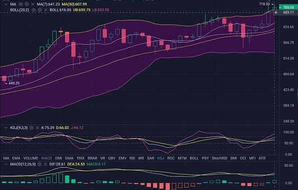 以太坊方面,昨日日線終以大陽收尾,日內整體維持震蕩格局,晚間9時左右在大餅漲勢平緩后,以太開啟了大幅補漲的局面,最高上行至718一線,再次破位年內高點。今晨以來,以太隨大餅走出一波深度回撤,最低下探到660附近,目前價格已反彈至709附近。