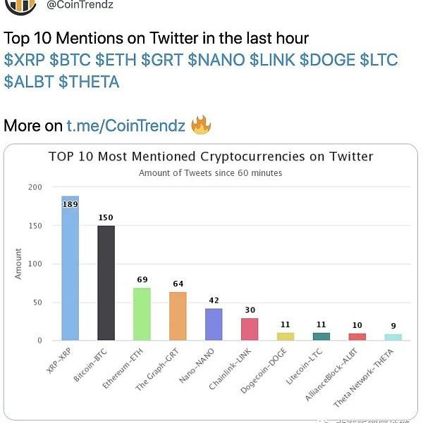 CoinTrendz.com數據顯示,過去一小時推特討論量排行中,XRP憑借189的討論量排名第一,BTC以150的討論量排名第二,ETH以69的討論量排名第三位。討論量排名四至十位的分別為:GRT、NANO、LINK、DOGE、LTC、ALBT、THETA。