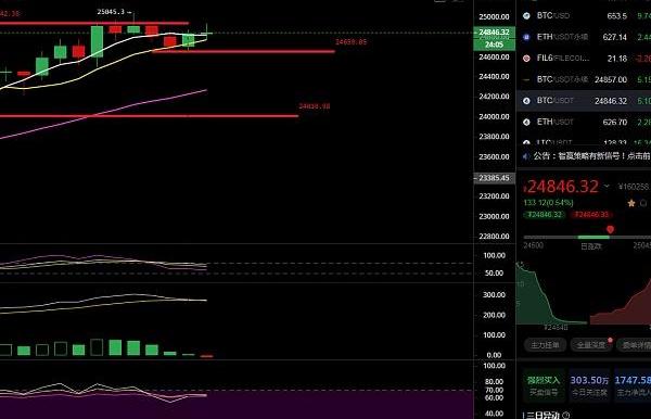 ???四小時技術級別來看,附圖指標布林帶開口呈上揚姿態,MACD多頭能量柱持續放量,各項指標均在中上軌運行,目前整體盤面延續多頭強勢,且支撐點位逐漸上移,回調力度偏弱;短期1小時級別來看,昨日幣價試探25000上方位置受阻走出回撤,且行情形成洗盤畫門形態,行情由弱轉暖走出階梯式上漲;日內下方支撐重點關注24500附近位置,若維持上方發展,幣價有望再次刷新歷史價格,反之試探再次突破下方支撐且穩,預計將有千點回調;操作上我們順勢而為即可,帶好防守位。?
