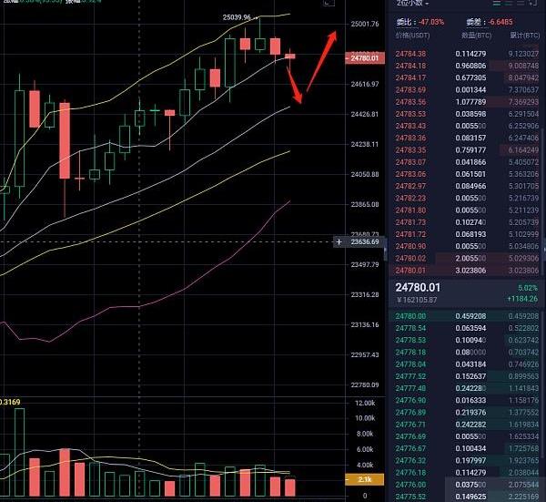操作策略:比特幣回撤下方24450-24600附近一線接多,防守24300,目標25000