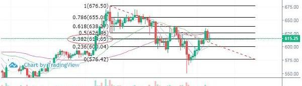 近期行情走勢波動較為偏大。正是我們把握大行情的好時機。此時我們應趁機抓取利潤。現在我們從1小時級別圖可以看到,經過昨天的一次下跌回調后。今天幣價繼續走入穩健的行情。目前幣價斐波那契38.2%分割線附近波動。可以看到下方支撐還是比較強勁的。另外,幅圖MACD綠柱動能在持續縮量。KDJ三線均呈朝上發散運行姿態。綜合各個技術指標看,短期回踩繼續看多。