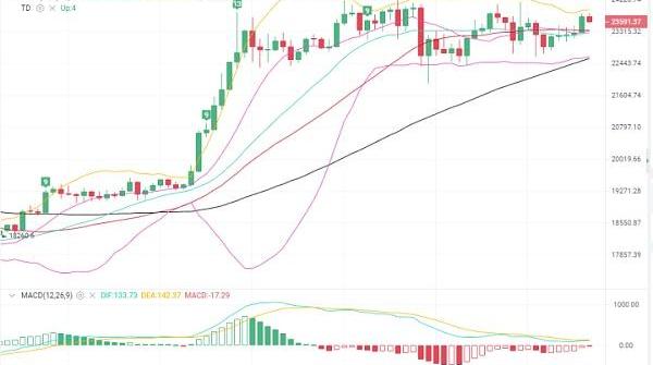 午夜多頭開始逐步發力,整體呈一個震蕩上行的趨勢向上運行,走了一波慢性上漲,目前在23600的位置附近,對于現在行情我們可以理解為筑底確認橫盤蓄勢,帶動各均線指標上行節奏跟上后又是新高
