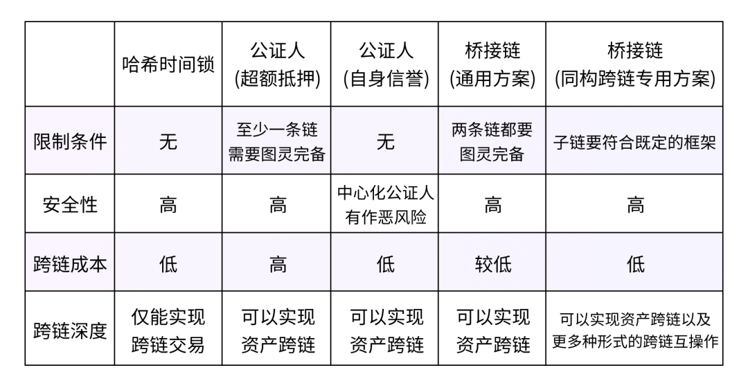 我們闡述了三大類(五小類)的跨鏈方案,我們將各方案的特性對比做成表格。