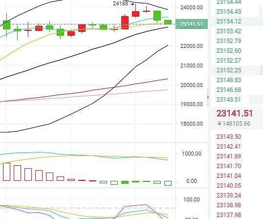 近期的比特幣行情大漲,日線的行情走勢來看,日線已經是收出了八連陽的行情,早間的行情走勢在日線收線之后,目前短線回調了下來,對于目前行情的短線回調,整體來說也算是比較正常的,畢竟近期的行情漲了這么多,行情也是一個回調修復,也是正常的盤面走勢,而目前附圖指標中我們可以看到KDJ與MACD的行情都是處于一個下行的狀態中,有進一步死叉下行的跡象,行情短線回調,在突破,也是時間的問題而已!而四小時的行情中午夜在突破新高以后,目前短線再一次的走進了回調之中,目前下方的主要支撐位我們可以看到MA20附近的23000附近的支撐位,這個位置也是MA20的關鍵支撐,行情回調下方有一個反彈的機會,因為目前附圖指標KDJ目前也是處于一個低位的狀態中,行情在經過了回調之后,才能進一步的上行,目前的行情短線回調,也是行情的蓄力走勢,趨勢未變,切莫胡亂追單!