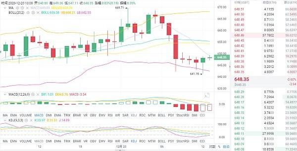 ???目前處于小時圖布林中軌上方運行,布林開口持續走平,昨日日線再度收陽,整體多頭格局滯后占優,早間承壓670-一線小幅度跳水。小時圖來看,布林帶通道收口有所走平。K線回踩下軌線后來到通道內運行。各均線靠攏托著K線向上。幅圖KDJ三線向下開口。MACD快慢線在0軸線上方,紅色能量縮量?總體來看目前還是空頭趨勢。