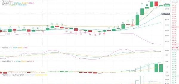 ??1小時圖看,以太和大餅走勢基本一樣,行情就不在解析。說明以太和大餅聯動性強。所以走勢和大餅一樣,一樣看多,而且大餅破新高了,以太能不破個新高、?目前在622位置。回落到615附近多單進場?目標635-645?止損609
