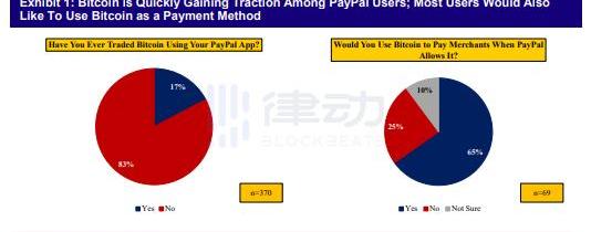 今年12月,瑞穗證券發布一份報告稱,在被調查的PayPal用戶中有17%的樣本表示已使用該平臺交易比特幣,而65%的樣本則表示將使用比特幣支付商品和服務。瑞穗還在報告指出,在用戶群中開放比特幣交易可能對PayPal股票價格有利,并上調了對該公司股價的預期。