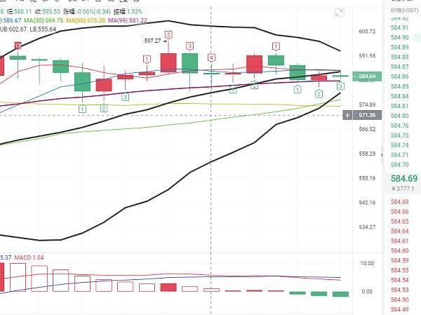 ????以太坊凌晨沖上593位置,受布林上軌壓制,幣價緩慢走跌,突破籌碼區觸及布林下軌,最低來到581短期有所支撐,幣價緩慢上升,目前在布林中軌受到壓制,晚間就重帶點關注布林中軌壓制上方強勁,如果晚間收線站穩布林中軌上方,那么我們就順勢多單,附圖上來看,MACD空頭緩慢縮量,快慢線在零軸下方運行,RSI快線觸及慢線向下發散。