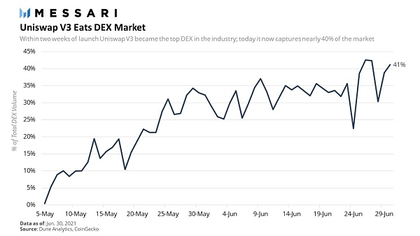 Uniswap V3目前占DEX總成交量的40%以上,并繼續蠶食DEX市場,沒有顯示出放緩的跡象。