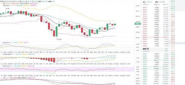 以太坊凌晨多頭突然發力,站上布林中軌,一根大陽柱拉升順勢打開布林通道向上,隨后幣價沿布林上軌一路上行,最高沖上573高點,目前幣價2連陰下跌,MA5拐頭向下在幣價上方形成短期壓制,附圖指標上來看,MACD多頭勢能縮量形態,快慢線在零軸上方運行,RSI三線在70下方粘合,KDJ三線呈死叉運行,操作建議空單進場。