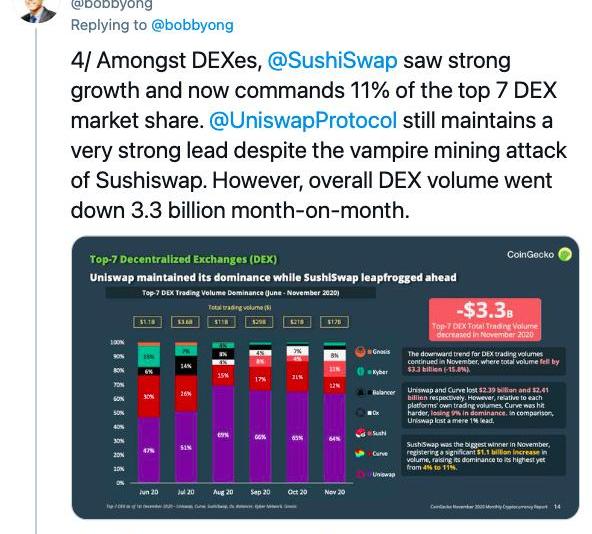 除此之外,更廣泛的DEX市場每天都在全球加密貨幣交易市場獲得更大的份額。CoinGecko首席執行官BobbyOng指出,“在DEX中,SushiSwap增長強勁,目前占據前7大DEX市場份額的11%。盡管被Sushswap‘吸血’奪取部分挖礦流動性,Uniswap仍然保持著非常強勁的領先優勢。不過,DEX整體月度成交量環比下降33億美元。”