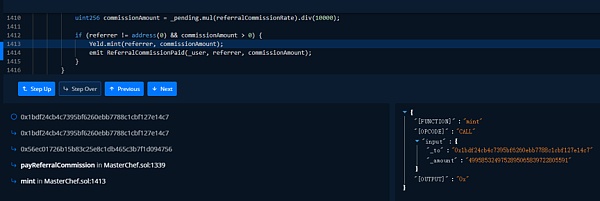 同時,因為攻擊合約B的推薦人是攻擊合約A,故在攻擊合約B領取獎勵時會對攻擊合約A發放推薦獎勵,計算方式為被推薦人獲取的獎勵的2%。由于傳入的_pending數量為異常大的值,故攻擊合約A獲得的推薦獎勵也為異常大的數量,攻擊合約獲得的推薦獎勵為: