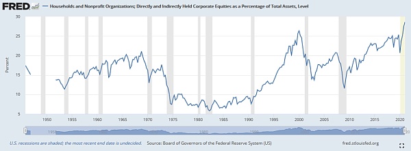家庭和非營利組織,直接或間接持有的公司股票占總資產的百分比 來源:FRED