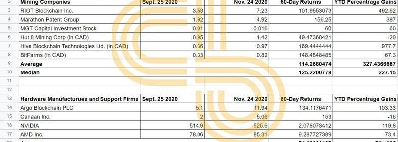更具體地說,硬件制造企業和像ArgoBlockchainPLC這樣的機構挖礦支持企業的60天平均收益率為74.6%。