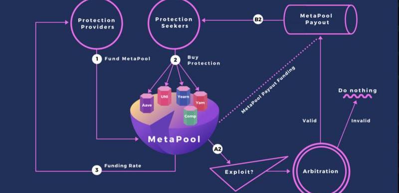 如果對MetaPool池所覆蓋保護的某個協議進行攻擊,則投保人可以向MetaPool的仲裁人提交索賠。仲裁人也是在創建池時設置的,并且必須根據MetaPool創建的參數主動確定索賠聲明的有效性。如果仲裁人確定某項索賠有效,則MetaPool支付的金額等于該保險覆蓋池中當前質押的資金加上MetaPool中其他保險池當前未使用的任何資金。