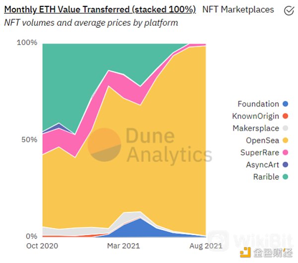 截止8月19日,OpenSea上的月ETH交易量份額占比高達98%,而SuperRare僅為1.2%,Foundation僅為0.6%,其余NFT交易市場的份額占比近乎可以忽略不計!