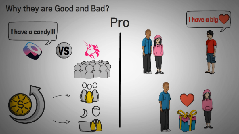 繼續,吸血鬼攻擊是好事嗎?現在你可能會認為SushiSwap搶走Uniswap的所有客戶是件壞事,但就像別人搶走你的女朋友一樣,這也有利弊。好處是,競爭為交易員和流動性挖掘者帶來了更好的利率。在你女朋友的情況下,如果有人對你的女朋友說"嘿,你應該轉到陰暗面"希望這能激勵你成為一個更好的男朋友,甚至可能是一個整體上更好的人,這在技術上對你和你的女朋友都有利。