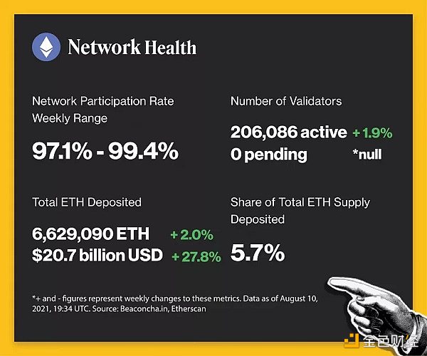 在該以太坊改進提案部署之后,可能對用戶預測幾分鐘或幾小時內的交易費用沒有太大幫助,但是卻可以消除當下網絡交易熱潮中的交易定價不確定性。下圖展示了過去一周以太坊2.0信標鏈上的網絡活動,其中網絡參與率達到97.1-99.4%,存入ETH總量為6,629.090 ETH,價值約合207億美元。