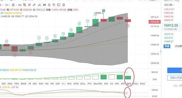 大餅早間一波沖高拉到15985附近遇阻,后續動能不足,開始震蕩回調,日間總體走勢維持在高位震蕩,現在運行在15450一線,從小時圖來看:布林帶縮口運行,K線運行在布林帶中軌,MACD快慢線在0軸線上方形成死叉,紅色量能柱增量。KDJ三線向下交叉,短期看有回調的趨勢。