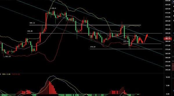 從四小時圖來看,短期多頭雖有所回暖,但每次都是沖高受阻,整體是一個下行趨勢,晚間操作我們還是以高空為主,上方關注388-390壓制,下方關注377-375支撐