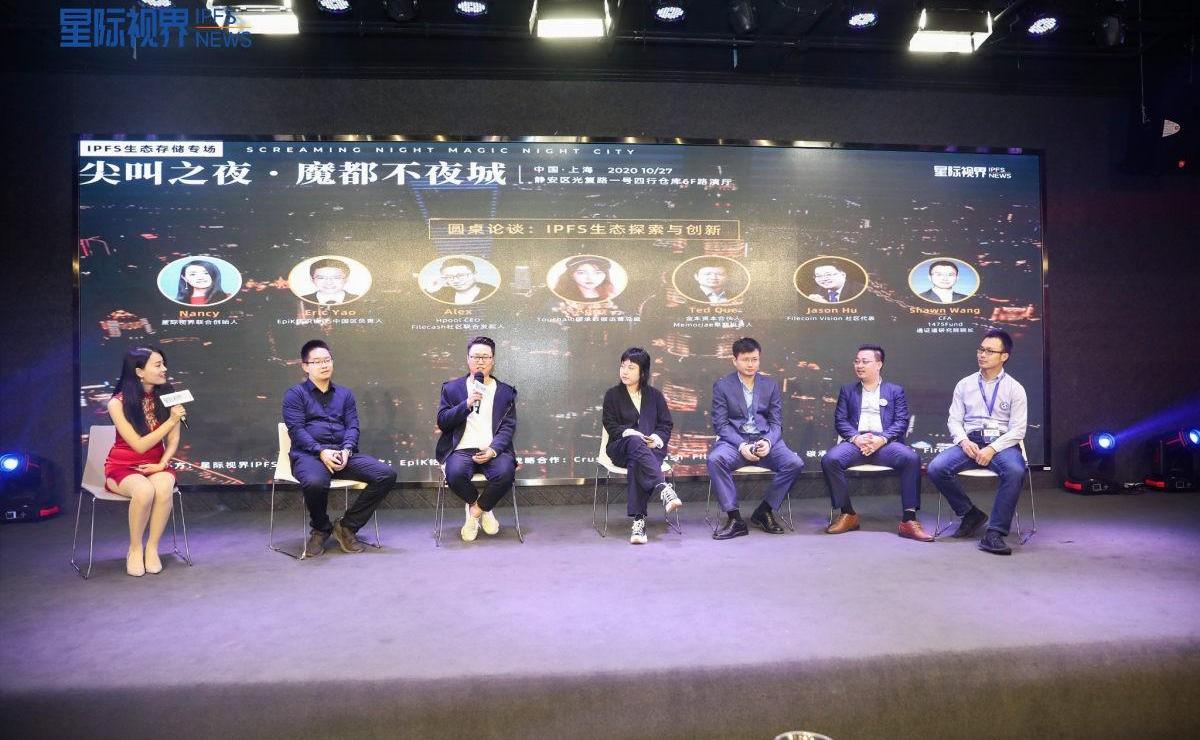 隨后迎來了今晚的巔峰時刻:圓桌論壇環節,本次圓桌主持人:星際視界IPFSNEWS聯合創始人?Nancy,嘉賓:EpiKx銘識協議中國區負責人EricYao;HpoolCEO,Filecash社區聯合發起人Alex;Touchain碳承數據運營總監Ago;金未資本合伙人,Memoriae早期投資人TedQue;FilecoinVision社區代表JasonHu;1475Fund&通證道研究院院長ShawnWang。圍繞“IPFS生態探索與創新”為主題,對“網絡協議革命”、“IPFS應用落地”、“分布式存儲未來規劃”、“Filecoin礦業市場”等超熱門話題進行頭腦風暴。