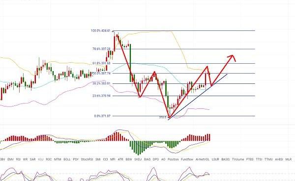 目前以太坊技術面技術面多頭較為強勁,短期以太坊價格已經觸碰布林帶上軌,有回踩需求。技術層面支撐是在384一線。斐波那契回調線38.2%也給到強有力的支撐效果。MACD指標快慢線即將突破零軸,目前金叉狀態向上運行。KDJ指標有拐頭向下的跡象。綜合各個周期及指標來看,短期以太坊有回踩需求,我們尋找低位接多即可。