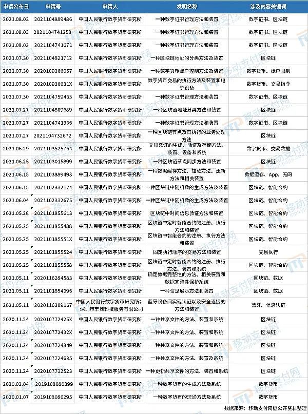 2020年-2021年上半年(截至8月初,下同)期間,數研所共計申請了30項專利,其中明確關于數字貨幣的僅有5項,涉及到區塊鏈技術的有高達23項,包括數字證書、交易憑證、智能合約、數據處理、共享文件等多個方面。