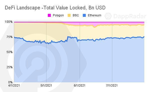 就鎖倉量而言,以太坊目前仍然是最領先的協議,這是由于?Uniswap、Aave、Compound?和?Curve?占據了 44.16% 的鎖倉量份額。目前,以太坊的總鎖倉量為 836 億美元,超過了整個行業指標的 70%。與前一個月相比,鏈上指數增加了 23%;與以太幣價格相比,以太坊上的總鎖倉量也增加了。以太幣在7月份呈上漲趨勢,漲幅為 17%。因此,我們可以推斷出該鏈上的總鎖倉量增長了約 6%。