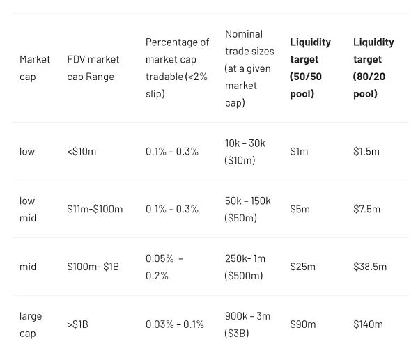如果項目沒有目標,他們就會陷入困境,試圖弄清楚他們是否有足夠的流動性以及是否應該支付更多費用。找到流動性上限目標,歸結為為較大的投資者找到可接受的最小交易規模,并確保池子有足夠的流動性來支持它在可接受的滑點范圍內(<2%)。通常,流動性的增加可支持對協議代幣的重新評級(向上),因為交易量足以供基金和大型投資者在二級市場購買。取消流動性上限目標可確保你為大型投資者提供足夠的代幣流動性,而無需支付超出要求的費用。