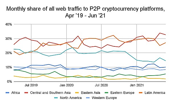 中亞和南亞、拉丁美洲和非洲在 P2P 平臺的使用流量(使用次數)比西歐和東亞等經濟規模更大的地區要多。