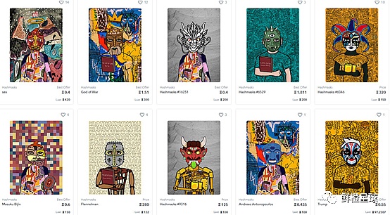 Hashmasks是另外一個OG收藏品NFT,其藝術風格比Cryptopunk更獨特,更有觀賞性,由全世界70多位畫家制作,一共只有16,384個。 和Cryptopunk不同的是,每一個Hashmask自帶藝術及商用版權,如果需要使用,需要獲得擁有者的允許。 Hashmasks也使用了大多數NFT項目所使用的曲線定價,越早參與項目(早期買家)價格越便宜。 Hashmasks通過不同物種,膚色,眼睛,物件和面具來區別,最貴的Hashmask在二級市場也賣出了420ETH的天價。 最近恰逢3-4月份的NFT熊市,很多Hashmasks都在被賤賣,Floor price也從1。5ETH跌倒了0。7ETH。