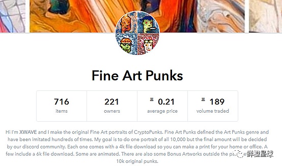 Fine Art Punk 也是比較早期的Punk衍生項目, 就是一位女畫家給一萬個Cryptopunk作畫, 完全首創, 靠個人硬核的畫技來為Punk增加藝術價值. 可惜沒怎么宣傳, 到現在也沒有被Opensea官方認可(verified). 她是最早用藝術的方式重新理解Punk的, 連晚幾周上線的Picasso Punk都是仿照她的 (第一個Punk幾乎一模一樣, 有抄襲的嫌疑). 后來啥梵高Punk, 達芬奇Punk, 莫奈Punk就更是跟風之流, 基本上就是一個濾鏡加在Punk上面然后撈錢。