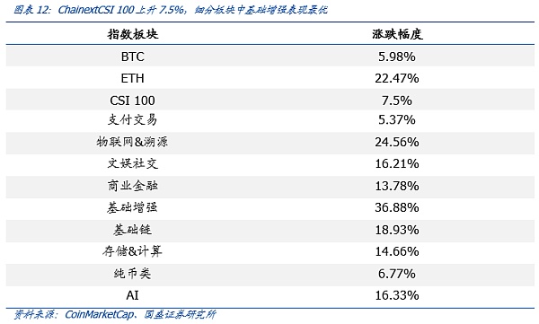 四、上周行情回顧:ChainextCSI 100上漲 7.5%,細分板塊中基礎增強表現最優