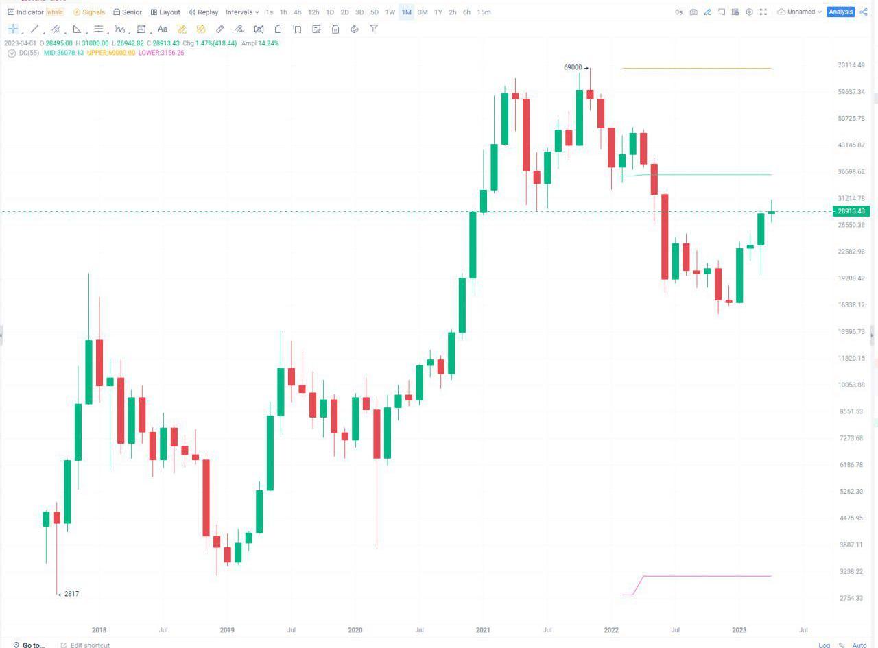 比特幣在第一季度測試了15000美元的支撐位,并開始了一路反彈。進入新的一個季度,BTC也開始了新的周線和月線級別的旅程。我們試圖引入唐奇安通道