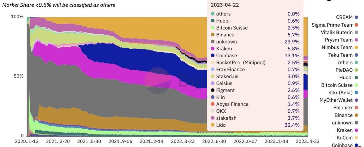 在上海升級之前,Kraken在以太坊質押市場份額約為7.2%,但自從啟動提款后,該指標下降到5.8%。總體而言,CEX在以太坊質押的市場份額有所下降,但CEX的以太坊質押池規模卻出現小幅上漲,從13.2%升至13.7%。