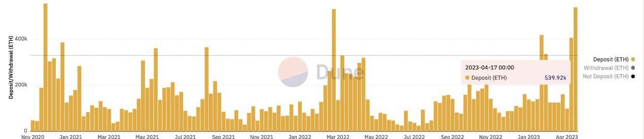 7、上海升級后出現了以太坊迄今第二大單周存款量