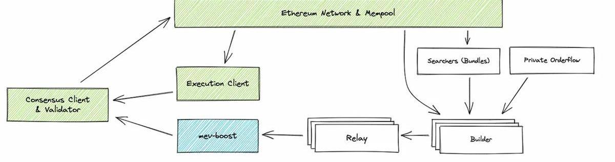 另一方面,驗證者是這種情形的主要受益者之一。事實上,權力越大,利潤越大:因為驗證者擁有決定運行哪些交易的權力,他們可以通過確定哪些交易給他們帶來最多的現金來獲得“排序優化”費用。然而,在實踐中,讓驗證者完成整個MEV搜索、打包和執行流程太過繁瑣。因此,大部分的“排序優化”被外包給了專門的搜索者、構建者和中繼器,這些中介可以想象成是驗證者的“秘書”,他們為了獲得一部分利潤而簡化了MEV的過程。具體而言,搜索者將尋找MEV機會,構建者將這些機會捆綁成完整的“塊”,中繼器將這些完整的“塊”發送給驗證者或實際的塊構建者。因此,現代MEV生態系統的總體情況如下: