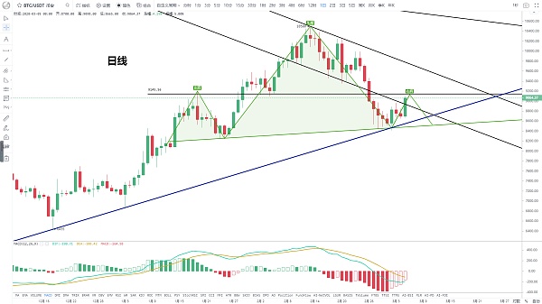 4小時級別前期構筑了一個頭肩底形態,目前價格向上突破頸線,維持量能,繼續向上將是大概率,按頭肩底形態漲幅,理論目標位于9500美元上方,短期壓力9150-9200之間,這個區域為潛在的日線頭肩頂形態的右肩頂部區域,突破站穩才能進一步打開反彈空間,日線MACD紅柱逐步縮短,快慢線有金叉趨勢,5日線拐頭上行,整體有震蕩走強的趨勢,目前量能是關鍵,關注潛在右肩頂部的突破情況。