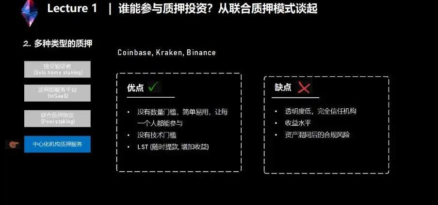 缺點:前述的那些痛點,都是從獨立驗證節點概括而出的,比如說數量門檻高、投入大、質押資本效率低、長時間鎖定無法提取、收益相對較低、硬件成本和技術門檻,對小白或者新手并不是那么友好。接下來說的三種類型,都會引入第三方或者平臺的概念。