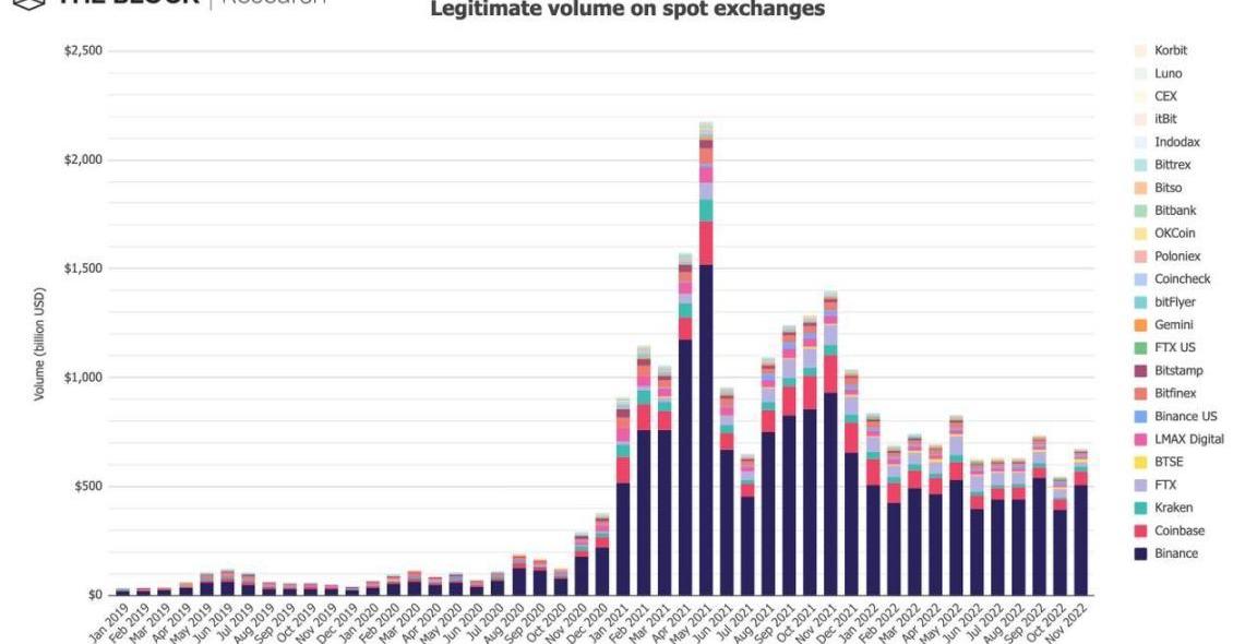 6、合規的中心化交易所現貨交易量增加23.7%至6729億美元: