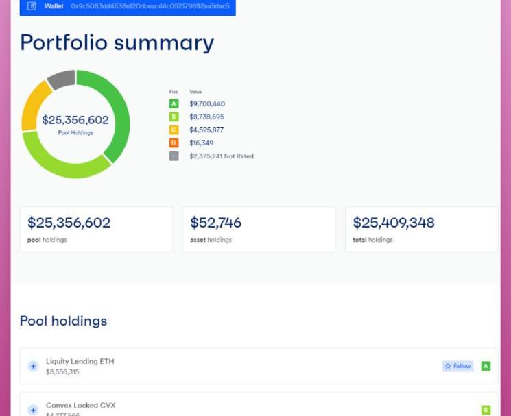 「評價錢包」功能會為你提供當前投資的風險分析。例如,在Tetranode的資產中,就有450萬美元的資產是被存入在風險較高的協議中。